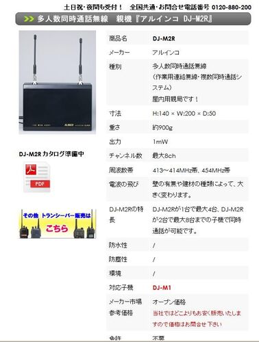アルインコの同時通話無線システムの屋内タイプの親局DJ-M2Rの詳細ページを作成しました。DJ-M2Rを1台使用すると子機DJ-M1が4台まで同時通話できます。DJ-M2Rを2台使用すると子機DJ-M1が8台まで同時通話できます。 屋外タイプのDJ-M1Rもあります。↓↓DJ-M2R製…