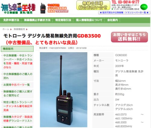 デジタル簡易無線免許局で人気No1.のモトローラGDB3500の中古整備品を入荷、販売開始しました。ものすごく綺麗な良品です。充電器、バッテリ付きで33,000円(税別)です。在庫限りですのでお早めにお問い合わせください。 ●モトローラ デジタル簡易無線免許…